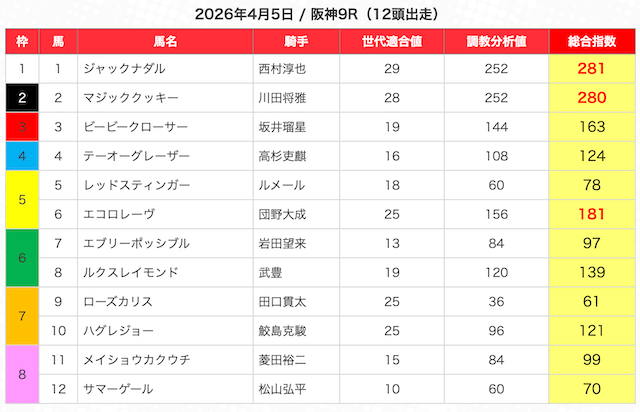| 指数 | AI系のサイトでよく用いられる形態。 高い数字が振られている馬の期待値が高くなります。 一日に提供する予想の本数が多いのも特徴です | ・複数の予想を見たい ・対象レースでの馬の評価が知りたい |