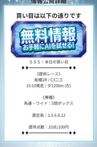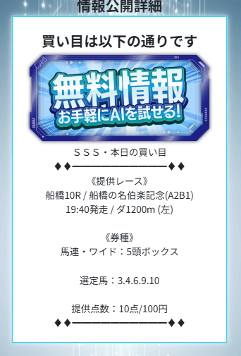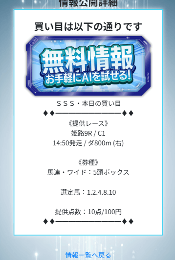 AIを名乗る以上、人気やオッズだけでなく指数っぽいロジックで妙味のある相手を混ぜてくる可能性はありますが、点数10点のボックスだと、結局は「堅実寄りの組み方」になりやすいでしょう。
