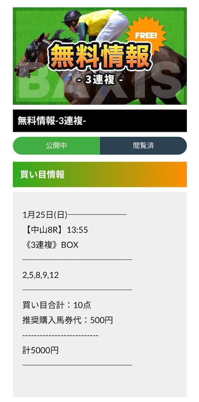 過去に利用した3連複の競馬予想サイトは大体20点前後で予想を出していたので、バクシスの無料予想を見た時は正直がっかりしてました…。