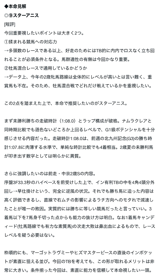 そのうえ、本命馬には短評(※例)が付いており、具体的な選出理由が記載されているため本命選びには納得感がありました。
