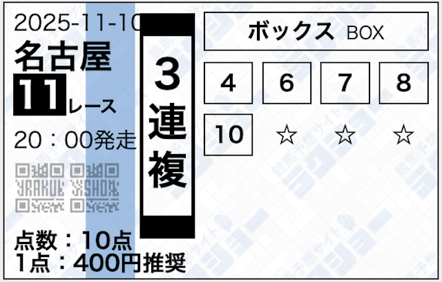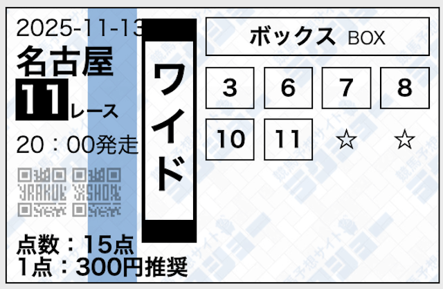 | 11月26日船橋4R | ワイド | 10,000円 | 153,500円 | 1535% | |