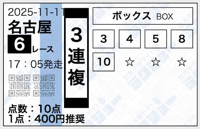 | 11月29日笠松8R | ワイド | 10,000円 | 44,800円 | 448% | |
