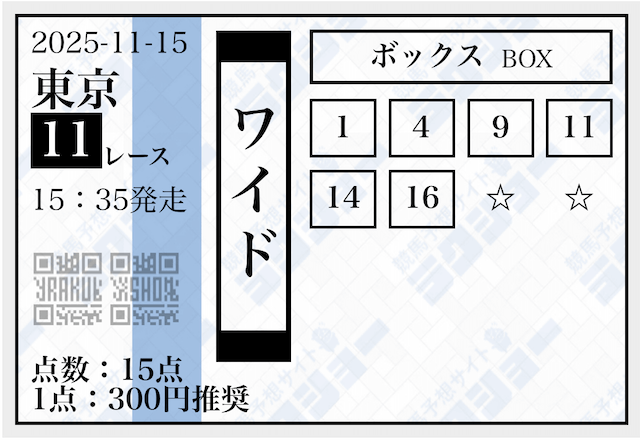 | 11月17日京都11R | ワイド | 10,000円 | 91,700円 | 917% | |