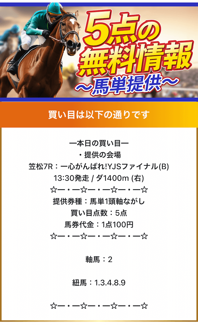| 川崎02R | スナオナキモチ | 3番人気 | 7.5倍 | 3着 | ☓ |