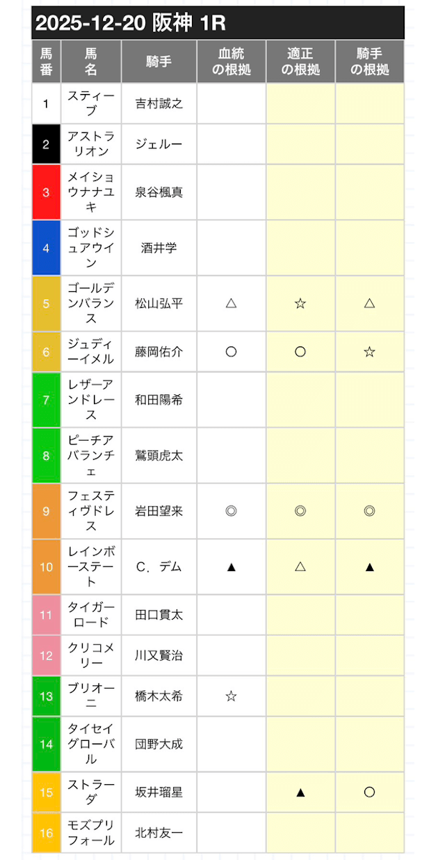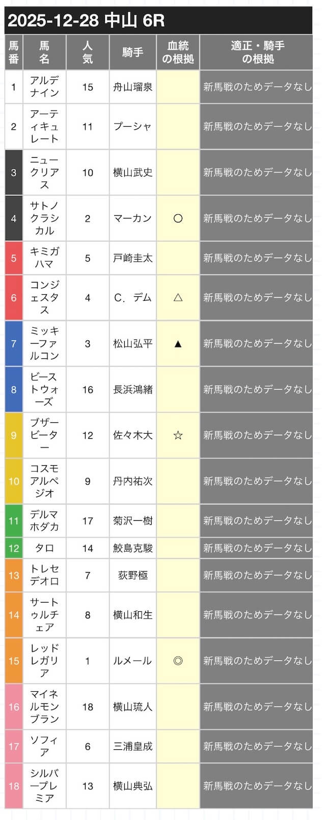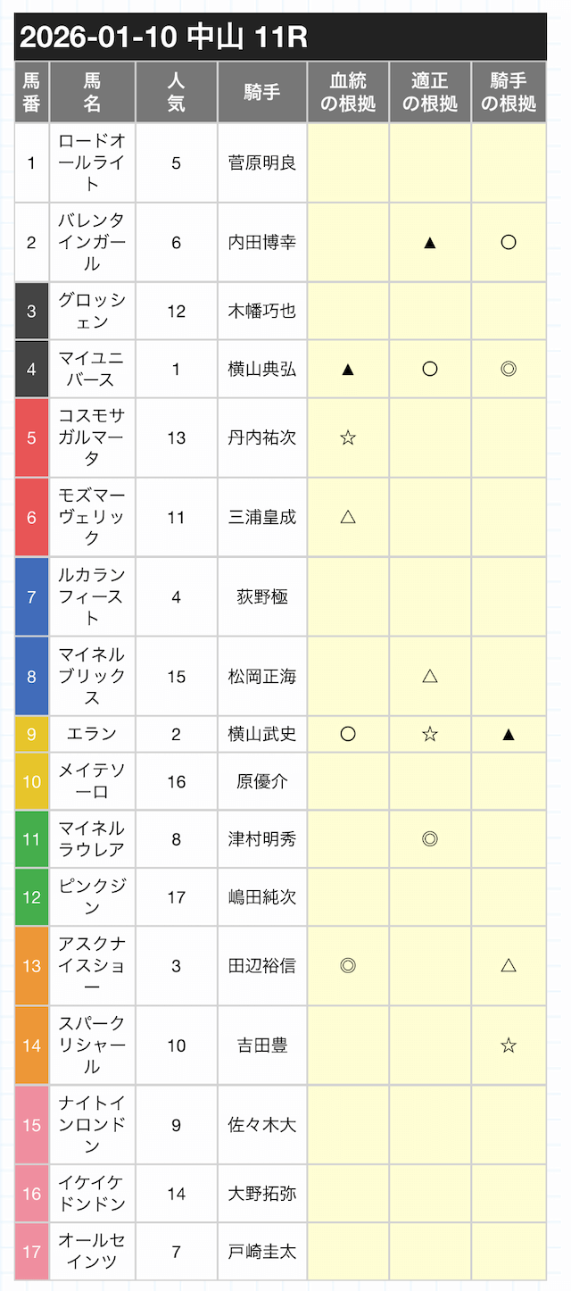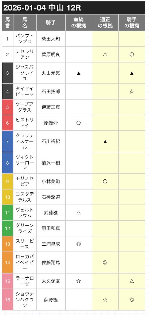 印の候補は、本命の◎・対抗の◯・単穴の▲がそれぞれ1頭ずつ。