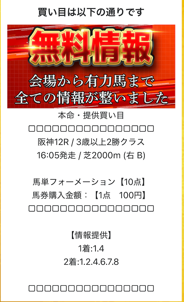 | 中山12R | シホノディレット | 2番人気 | 4.2倍 | 11着 | ☓ |