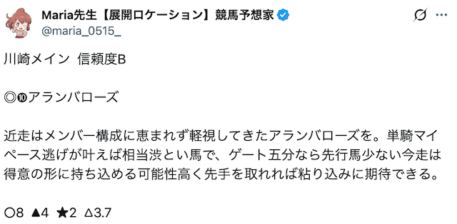 地方・中央問わずに頻繁に買い目を公開しているため、Maria先生の予想が気になっている方はまずこちらから試してみると良いでしょう。