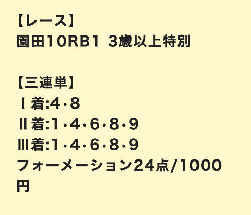 | 11月6日園田10R | 3連単 | 24,000円 | 27,000円 | 112.5% | |