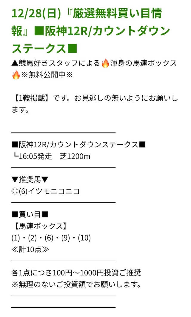競馬場ごとに1〜6レースまでの買い目が無料で提供されるというもので、3会場で開催される日は最大で18鞍分の予想を提供。