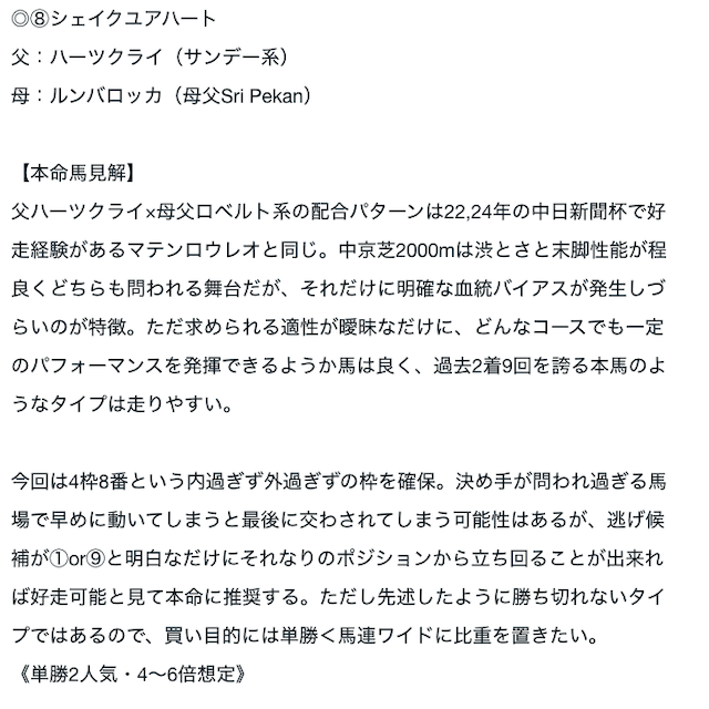 それだけでなく、本命馬の見解も添えられている(※例)ため、本命選定における納得感はあります。