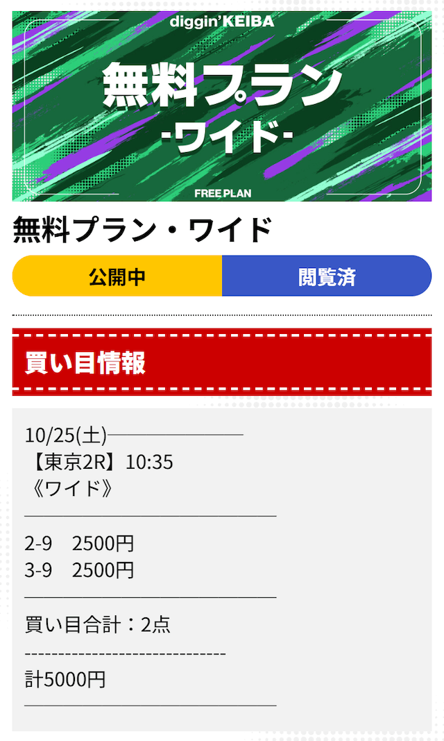無料予想は中央競馬のみで、土日に1レースずつ予想が公開されました。