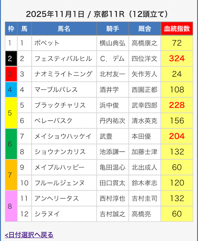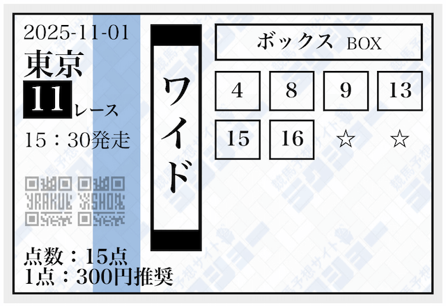 | 11月1日京都11R |  ワイド |  10,000円 |  43,300円 |  433% |    |