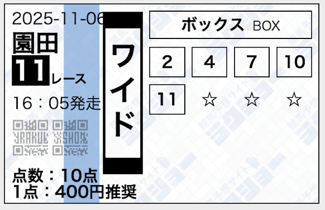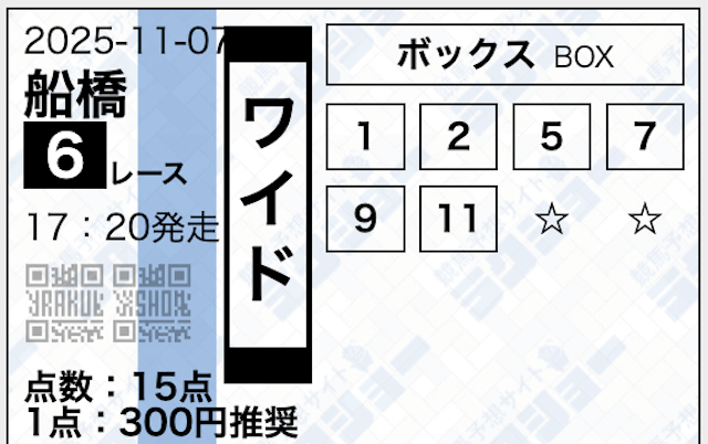 | 11月26日船橋4R | ワイド | 10,000円 | 153,500円 | 1535% | |