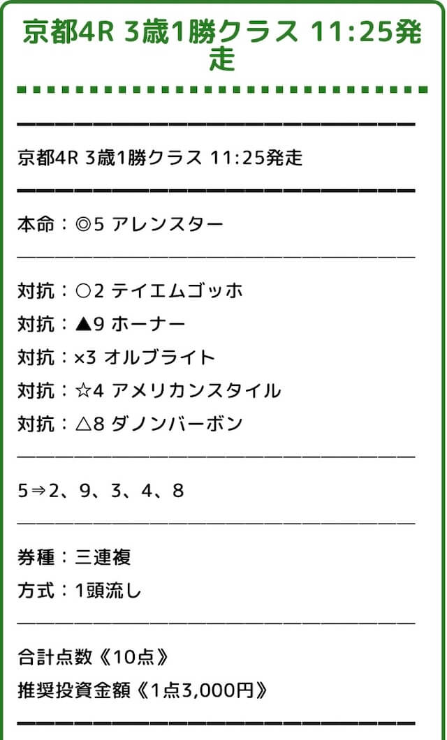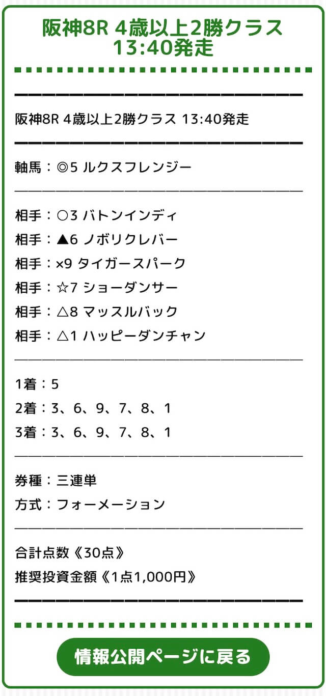 具体的な買い目を公開していますが、予想印も同時に掲載されているので、みどりの的中らんどが選んだ馬の優先順位も分かりやすくなっています。