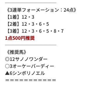 FIRSTは3連複のみで、投資効率も33.3倍とかなり強気。