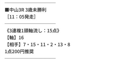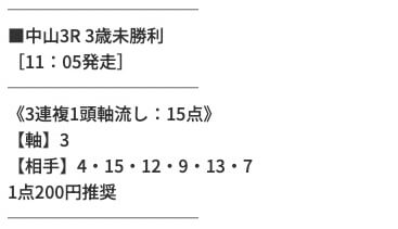 | FIRST | 6,000 | 200,000 | 33.3倍 | 3連複 |