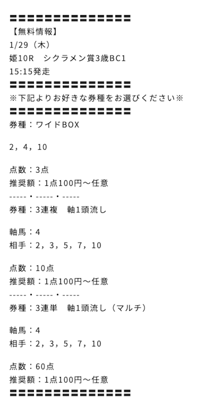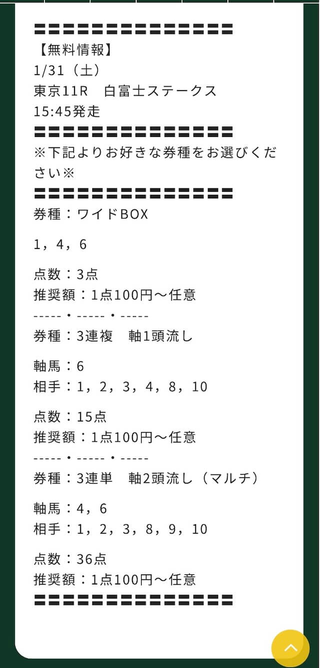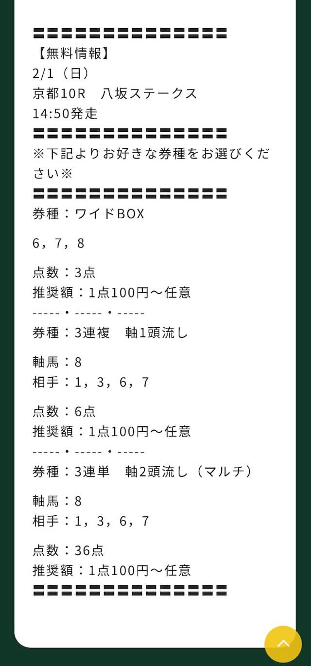 事前に下調べした感じでは当たる意見と当たらない口コミが半々くらいだったからモノは試しで無料予想に参加。