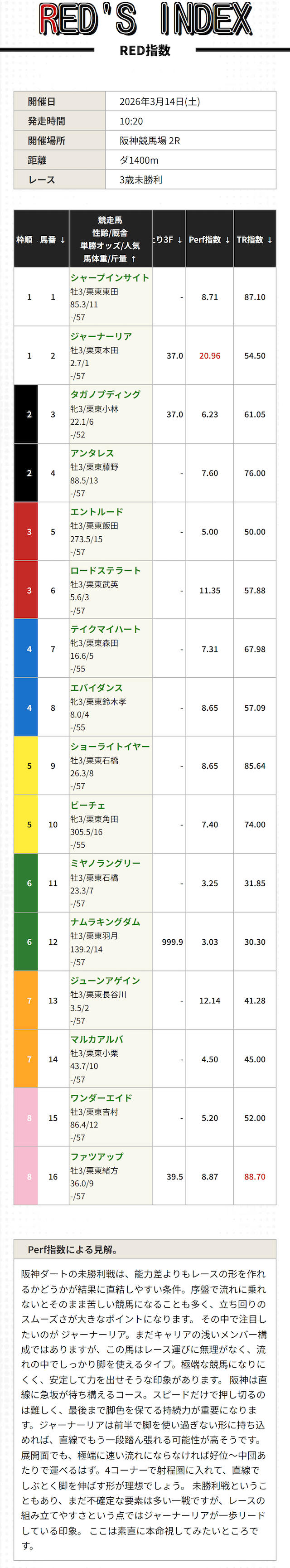 1番人気:1.4倍 - ⑮プラチナムディスク(Perf指数2位)