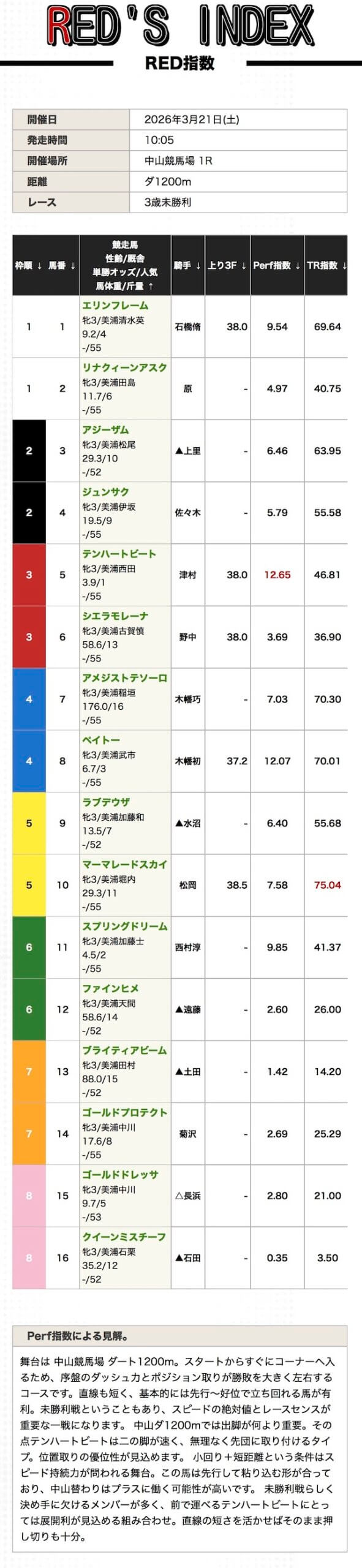 7番人気:25.9倍 - ⑯アクロスメモリア(Perf指数3位&TR指数2位)