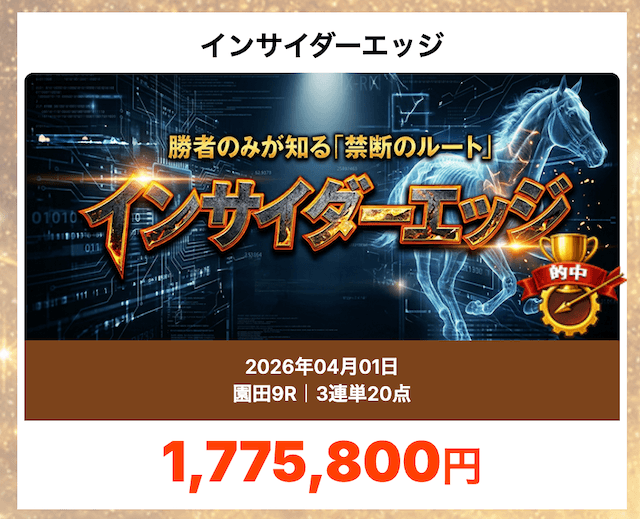 競馬2.0![]() | 23戦17勝6敗 +252,800円 | 87%/205.3% | 時代のトレンドに敏感で、常に新しい情報を予想に反映。 最新のAIを活用し、予想の変化に対応しながら高水準の数値を残している。 |