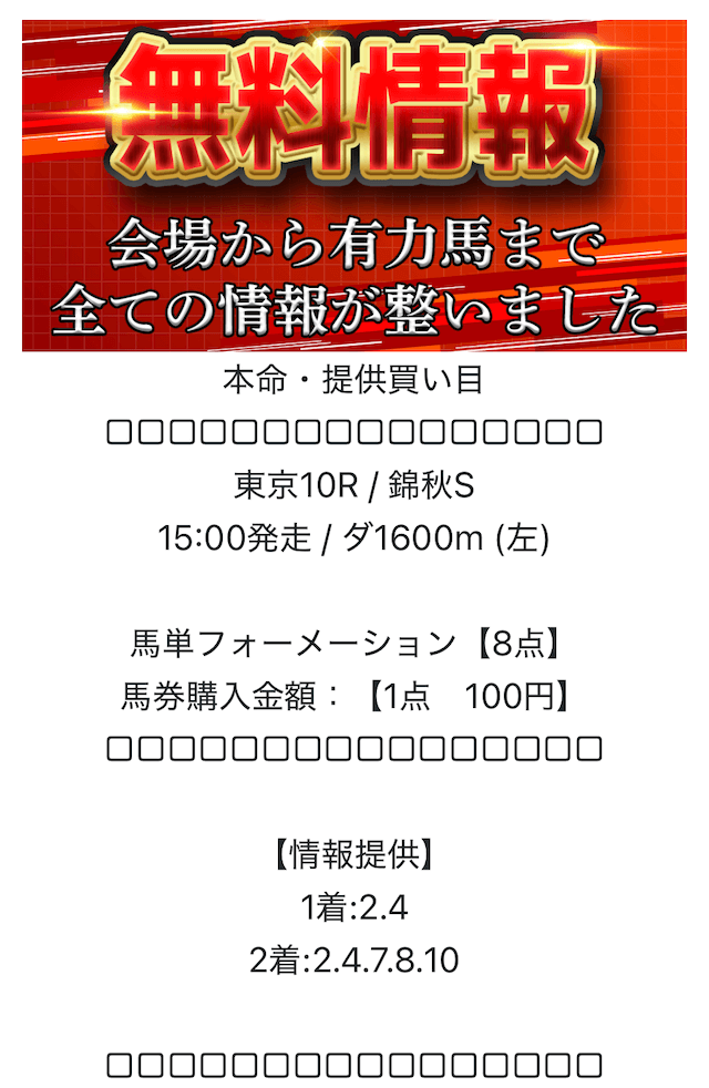 | 本命 | 11戦10勝1敗 +636,200円 | 90% | 689% | ▶84件の評価を見る |