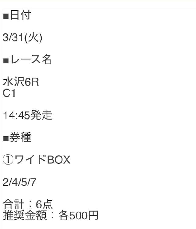 | 戦績 | 134戦114勝20敗 | 的中率 | 86.6% | 回収率 | 205.2% |