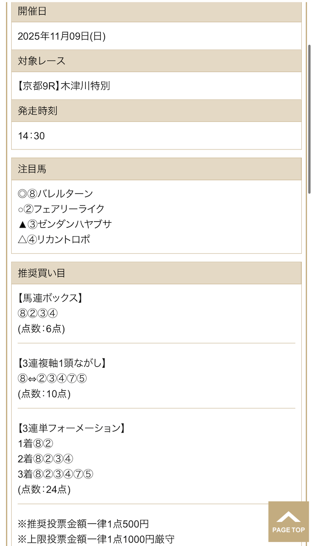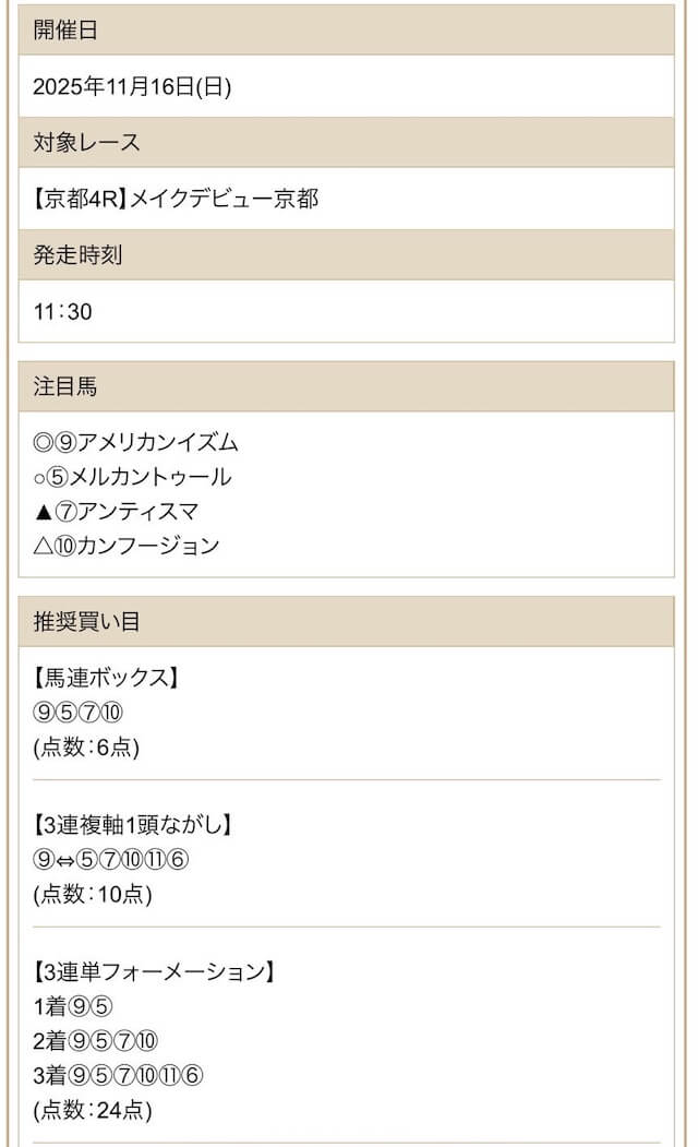 | 戦績 | 57戦48勝9敗 | 的中率 | 86% | 回収率 | 259.5% |