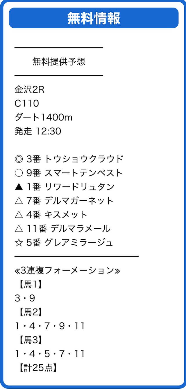 | 戦績 | 121戦94勝27敗 | 的中率 | 78.5% | 回収率 | 233.8% |