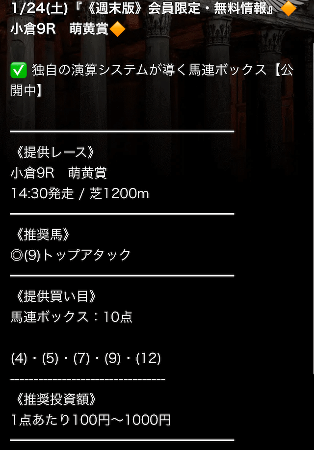 | 戦績 | 50戦41勝9敗 | 的中率 | 84% | 回収率 | 491% |
