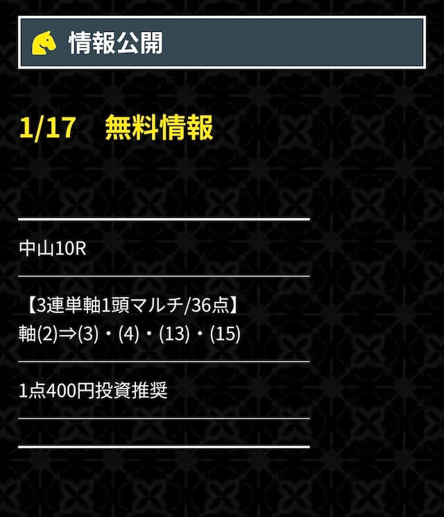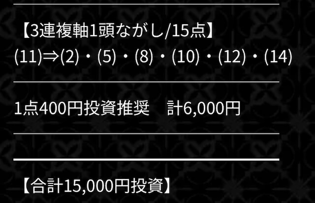 | 戦績 | 56戦41勝15敗 | 的中率 | 73.2% | 回収率 | 594.9% |