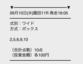 | 9月10日園田11R | ワイド | 1,000円 | 7,630円 | 763% | |