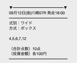 | 9月12日川崎7R | ワイド | 1,000円 | 0円 | 0% | |