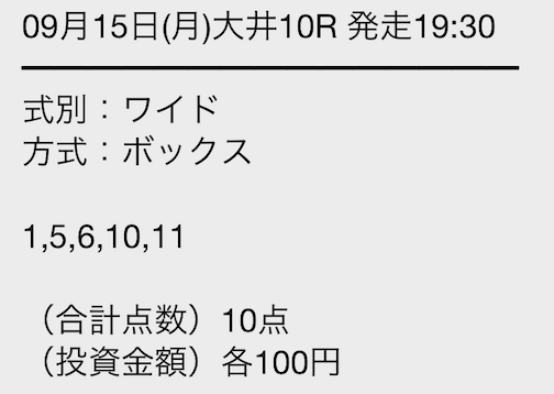 | 9月15日大井10R | ワイド | 1,000円 | 1,180円 | 118% | |
