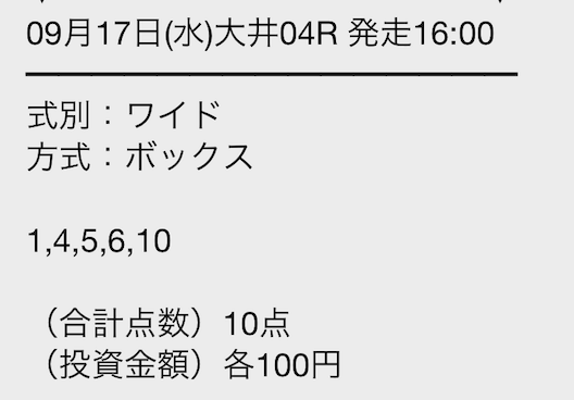 | 9月17日大井4R | ワイド | 1,000円 | 1,370円 | 137% | |