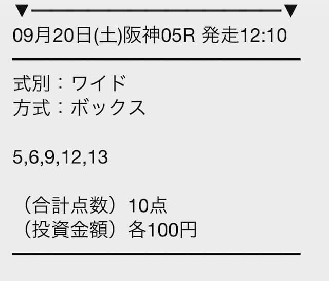 | 9月20日阪神5R | ワイド | 1,000円 | 3,400円 | 340% | |
