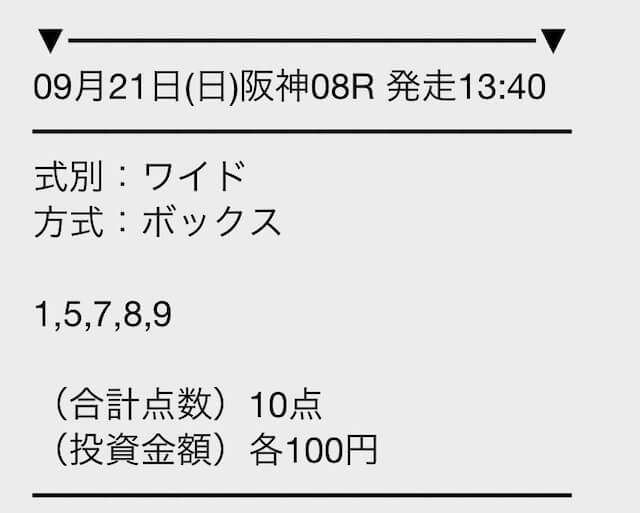 | 9月21日阪神8R | ワイド | 1,000円 | 3,510円 | 351% | |