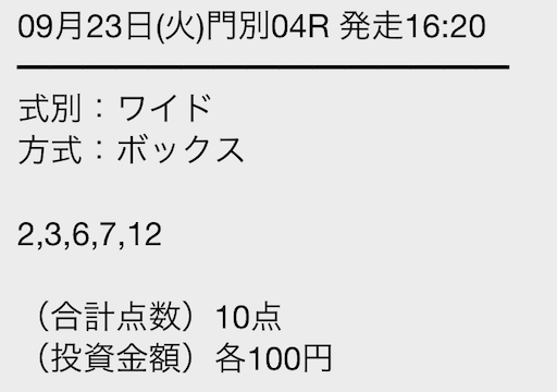 | 9月23日門別4R | ワイド | 1,000円 | 1,280円 | 128% | |