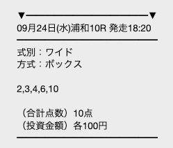 | 9月24日浦和10R | ワイド | 1,000円 | 1,710円 | 171% | |