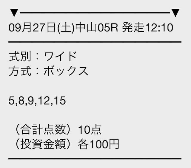 | 9月27日中山5R | ワイド | 1,000円 | 1,070円 | 107% | |