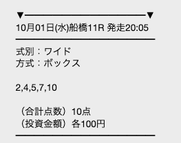 | 10月1日船橋11R | ワイド | 1,000円 | 2,370円 | 237% | |