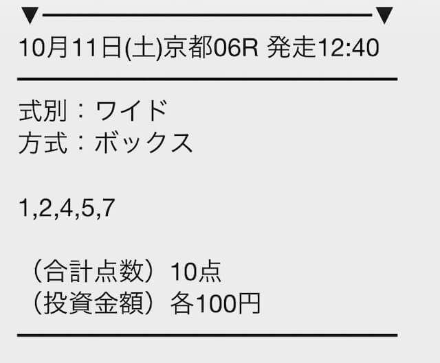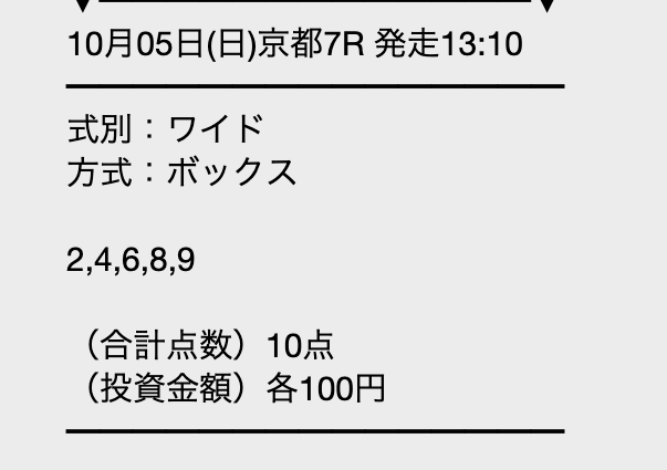 | 10月5日京都7R | ワイド | 1,000円 | 2,640円 | 264% | |