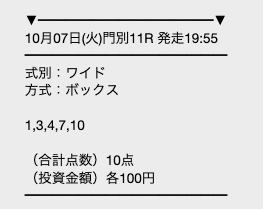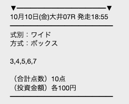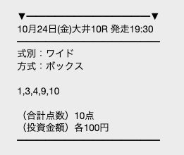 | 10月10日大井7R | ワイド | 1,000円 | 1,860円 | 186% | |