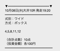 | 10月8日大井10R | ワイド | 1,000円 | 1,320円 | 132% | |