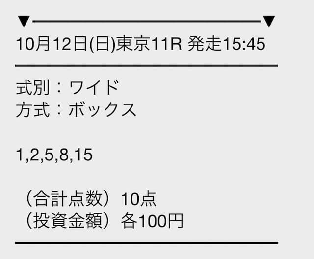 | 10月12日東京11R | ワイド | 1,000円 | 1,440円 | 144% | |