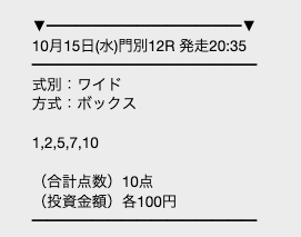 | 10月15日門別12R | ワイド | 1,000円 | 1,510円 | 151% | |