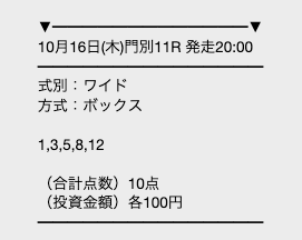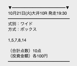 | 10月21日大井10R | ワイド | 1,000円 | 0円 | 0% | |