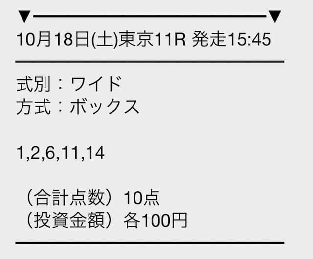 | 10月18日東京11R | ワイド | 1,000円 | 1,100円 | 110% | |