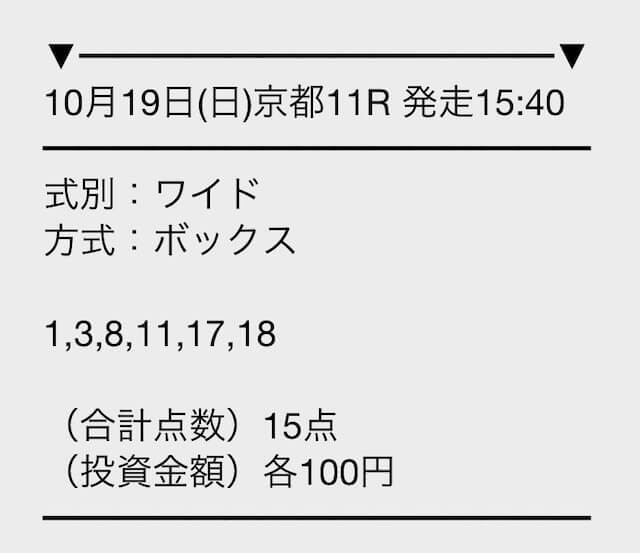 | 10月19日京都11R | ワイド | 1,500円 | 2,220円 | 148% | |