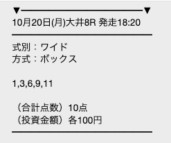| 10月20日大井8R | ワイド | 1,000円 | 1,190円 | 119% | |
