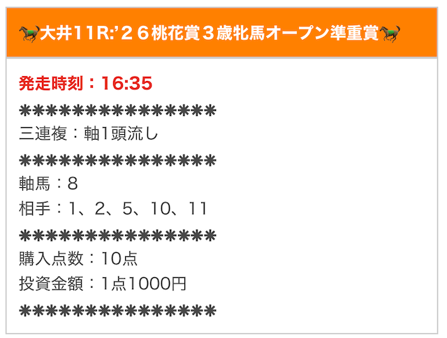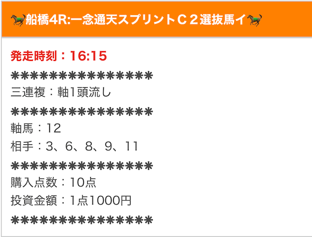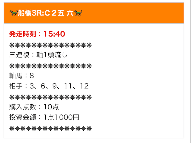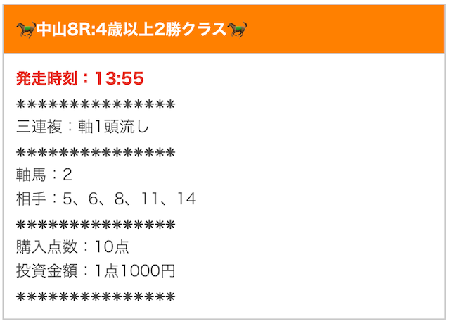 | 戦績 | 220戦180勝40敗 | 的中率 | 81.8% | 回収率 | 280.4% |